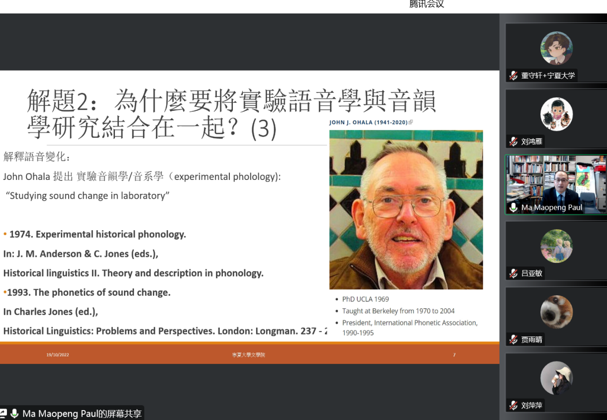 10月19日下午,ylzzcom永利于腾讯会议平台举行了题为“实验语音学与音韵学研究”的学术讲座。本次讲座特邀香港岭南大学中国语文教学与测试中心高级讲师,陕西师范大学语言科学研究所兼职教授马毛朋博士主讲。讲座由ylzzcom永利副院长刘鸿雁主持,汉语言文字学学位点、语言学及应用语言学学位点全体研究生参加本次线上讲座。