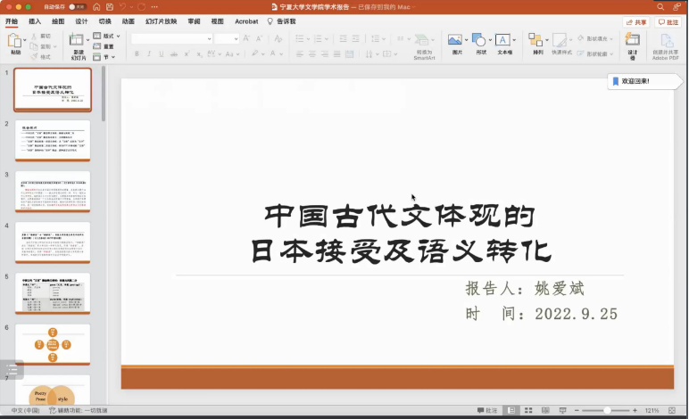 为拓宽学术视野,启迪学术智慧,9月25日晚6时30分,ylzzcom永利总站线路检测举办了题为“中国古代文体观的日本接受及语义转化”的学术讲座,讲座采用线上的形式展开。本次讲座特邀北京师范大学ylzzcom永利教授,北京师范大学文艺学研究中心研究员,博士生导师姚爱斌老师主讲,讲座由ylzzcom永利总站线路检测梁祖萍教授主持,ylzzcom永利总站线路检测及宁夏其他高校部分师生参加了本次讲座。