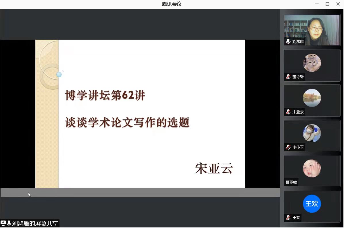 12月22日晚,人ylzzcom永利于腾讯会议平台举行了题为“谈谈学术论文写作的选题”的学术讲座。本次讲座特邀中国社会科学院语言研究所博士后,北京大学长聘副教授,中文系副主任宋亚云老师主讲。讲座由人ylzzcom永利副院长刘鸿雁主持,汉语言文字学专业全体研究生及学院部分教师参加了本次线上讲座。