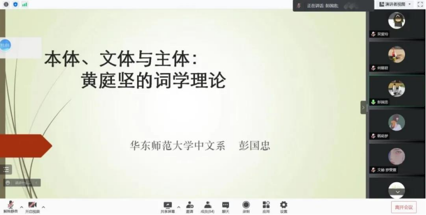 11月7日晚7时,永利集团人ylzzcom永利于腾讯会议平台举行了题为“苏门词人黄庭坚的词学理论”的学术讲座。本次讲座特邀华东师范大学中文系教授,博士生导师彭国忠教授主讲,永利集团人ylzzcom永利梁梅副教授主持,人ylzzcom永利部分教师、研究生与本科生参加了本次讲座。