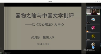 12月3日晚上19时30分,永利集团人ylzzcom永利于腾讯会议平台举行了题为“器物之喻与中国文学批评”的学术讲座。本次讲座特邀暨南大学ylzzcom永利中文系教授、博士生导师闫月珍老师主讲,讲座由梁祖萍教授主持,人ylzzcom永利研究生与部分本科生参加了本次线上讲座。