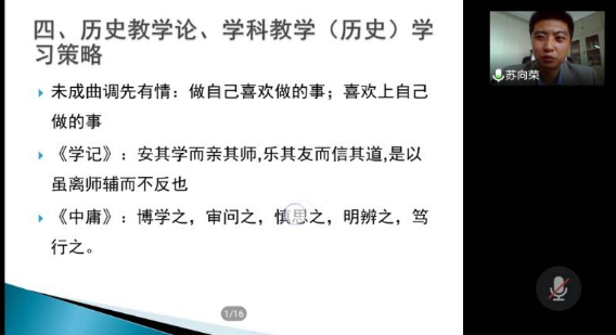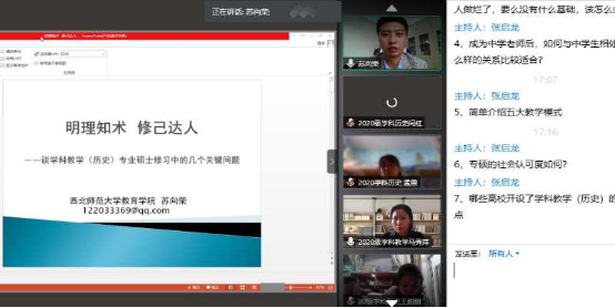 “剑虽利,不厉不断;才虽美,不学不高”。学无止境,成长亦无止境!为提高同学们对学科(历史)专业发展的认识,扩宽视野,增长才干。10月7日下午3点,人ylzzcom永利历史系同学们迎来了西北师范大学苏向荣副教授的精彩讲座—《明理知术、修己达人—谈学科教学(历史)专业硕士修习中的几个关键问题》。苏向荣老师是课程与教学论专业博士,西北师范大学教育学院副教授,硕士生导师,继续教育学院副院长,他主要从事课程与教学研究、历史教师专业发展研究,对于中学历史课程教学颇有建树。讲座由人ylzzcom永利副教授张启龙老师主持,人ylzzcom永利学科教学(历史)专业全体师生和部分本科生参加本次线上交流。