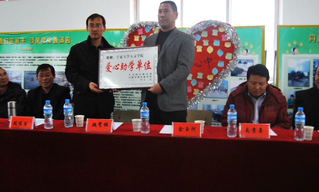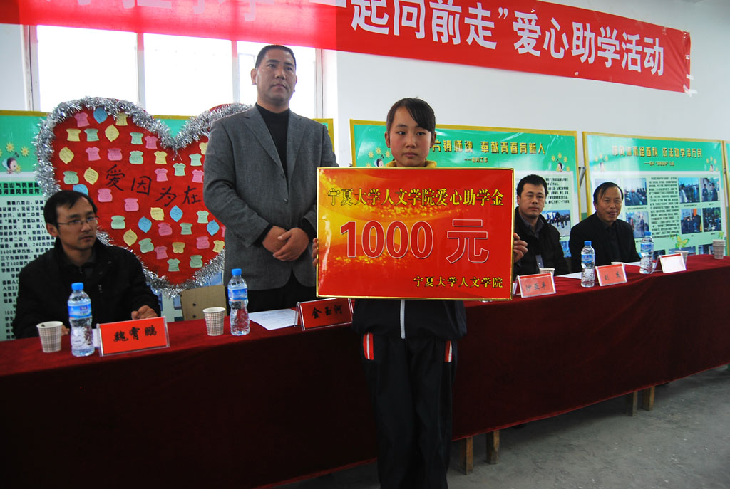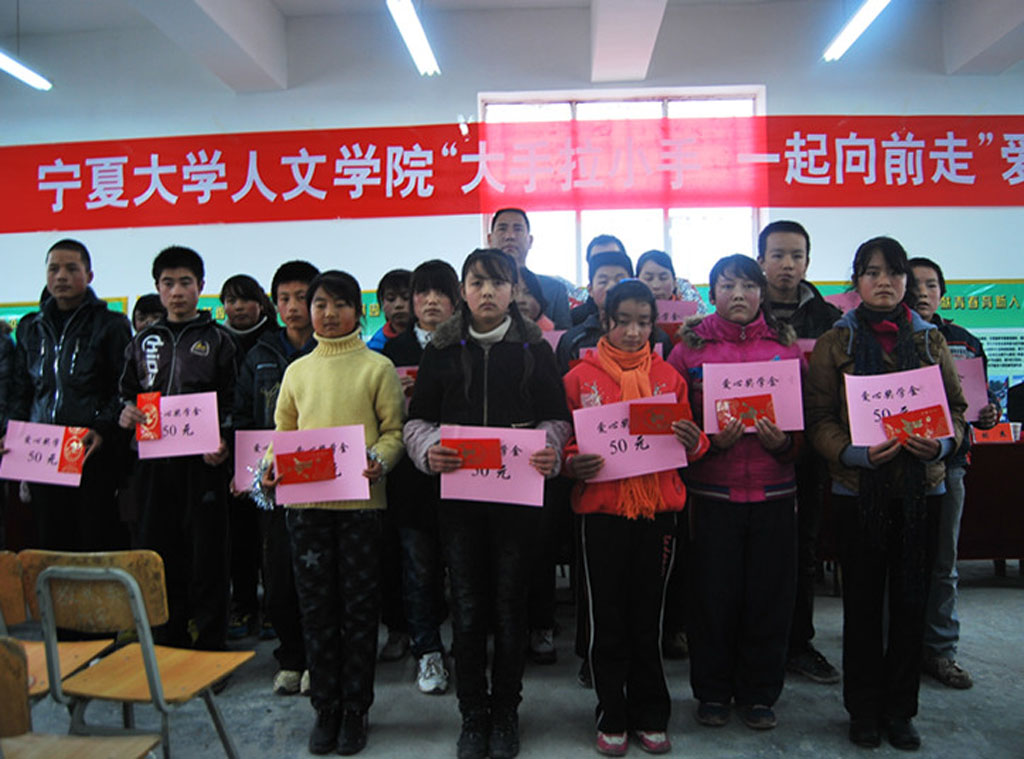 12月3日下午2:00在泾源县二中活动室,在中共泾源县团委领导、泾源县教育局领导、泾源县二中校领导的支持和准备下,人ylzzcom永利46名师生与泾源县二中62名同学的参与下,“永利集团人ylzzcom永利‘大手拉小手,一起向前走’爱心助学活动”顺利举行。活动中,人ylzzcom永利向全校24名品学兼优学生每人发放50元奖学金,向家庭困难学生代表发放爱心助学金1000元,并向各班发放爱心助学物资,主要是体育用品,如篮球、羽毛球、乒乓球等。同时由泾源县团委、泾源县教育局、为永利集团人ylzzcom永利授予“爱心助学单位”荣誉称号。