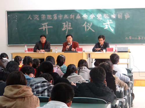 学院党总支书记梁向明在开班仪式上讲话。梁书记要求所有参加培训的同学务必端正学习态度,挤出时间,不仅要按时参加培训班的讲座,还要保质保量的参加党支部的讨论,主动发言,深入思考,争取利用集中学习和讨论的机会,提升党的理论水平和自身综合素质。最后,梁书记代表学院党总支对参加本期党校培训班的学员表示热烈的欢迎。开班仪式由学院党总支副书记陈柯老师主持,他对学院举办本次党校培训班的目的、意义等做了简单说明。