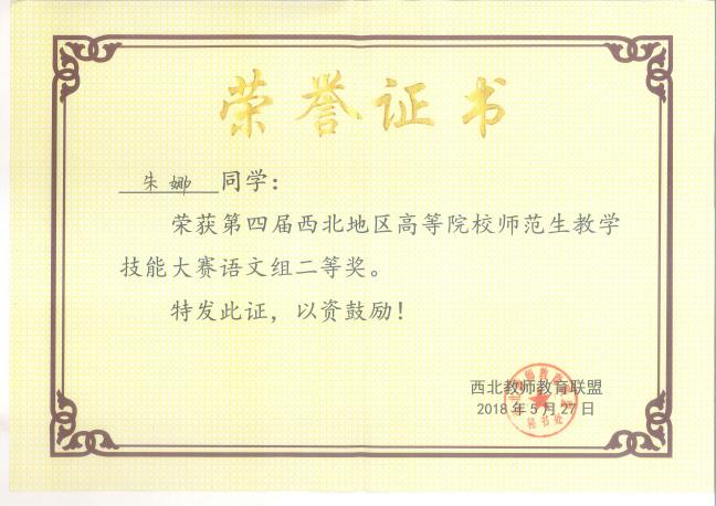 五月清风拂人面,但闻年少竞争先。2018年5月27日,由西北教师教育联盟主办,陕西理工大学承办的第四届西北地区高等院校师范生教学技能大赛在汉江之滨落下帷幕。陕西师范大学、西北师范大学、永利集团等17所西北地区高校参加了此次比赛。大赛分为语文组、数学组、学前教育组三个组别,每校每组推选一名优秀本科生参加比赛。经过激烈的角逐,我院2015级汉语言文学(教师教育)专业的朱娜同学脱颖而出,荣获语文组二等奖。