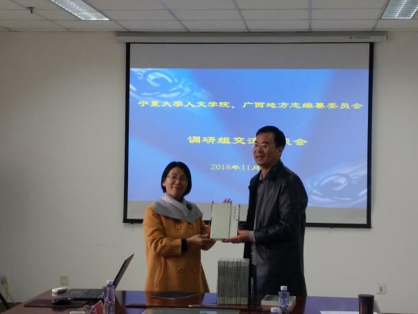 座谈会上,胡玉冰向广西地方志编纂委员会赠送学院新近出版的《宁夏珍稀方志丛刊》和《宁夏旧志研究》共9册图书,以及《朔方文库》宣传册。