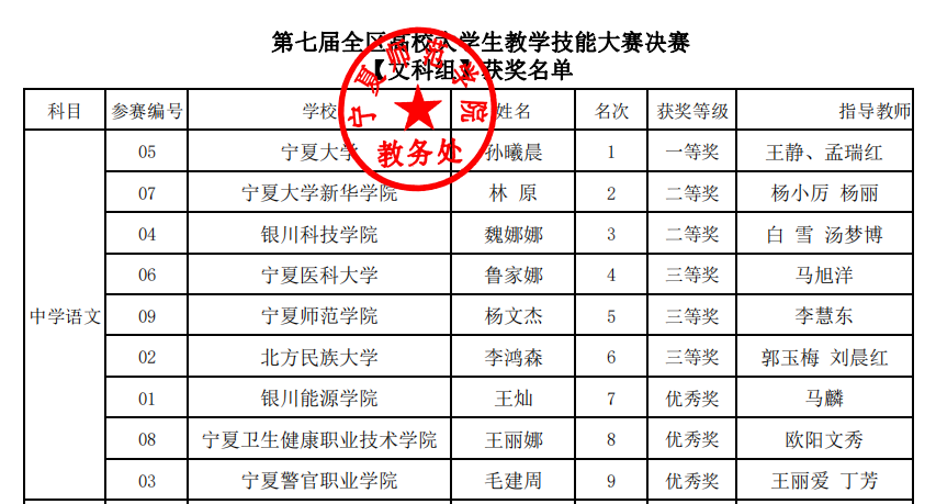 2023年11月27日第七届全区高校大学生教学技能大赛落下帷幕。来自永利集团、北方民族大学、宁夏师范学院、宁夏医科大学等13所高校151名学生入围全区决赛。我院2020级汉语言文学(教师教育)专业本科生孙曦晨在此次比赛中荣获文科组(中学语文)一等奖,王静老师、孟瑞红老师荣获优秀指导教师奖。