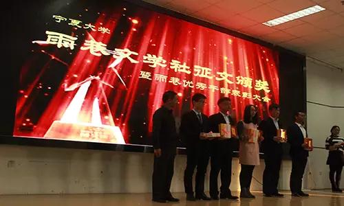 接着,学生与诗人的朗诵互动活跃了现场的气氛。学生代表朗诵了《大堰河,我的保姆》、《我用残损的手掌》和《不忘初心》,优美的配乐加上同学们的深情朗诵拉近了学生与作者的距离,让学生们更进一步的感受了诗人的情怀。宁夏著名诗人单永珍、查文瑾及谢瑞也朗诵了自己的诗作,为朗诵会助兴。之后,为鼓励雨巷文学社在不断发展过程中产生的优秀雨巷人和涌现出的优秀作品,嘉宾王怀凌、郭宁、李东星、丁峰山为其颁奖。诗歌体现着中国文化的博大精深,用极具感染力的声音走进诗人的心田,让人回味历史,重温感情。为此,在朗诵会的尾声,雨巷成员朗诵了《雨巷》和《赞美》,让学生回味经典,陶冶情操。